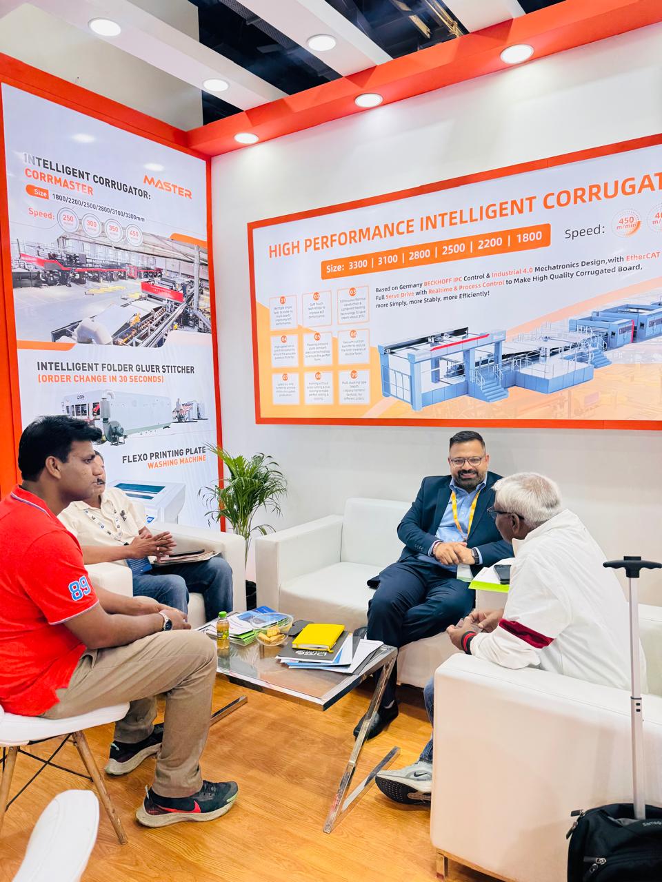 Our India branch sales director Mr.Naresh and local team join the exhibition and our technological innovation and high-quality machinery leave a deep impression on our customers. We're glad to get many new inquiries for new carton plant and update project of corrugator and high performance converting machines, such as flexo folder gluer with pre feeder and robot palletizer, load former, flatbed diecutter, folder gluer stitcher, slitter socrer. We're so glad to get these good news and ready to do the best assistance to start the long term cooperation with customers.